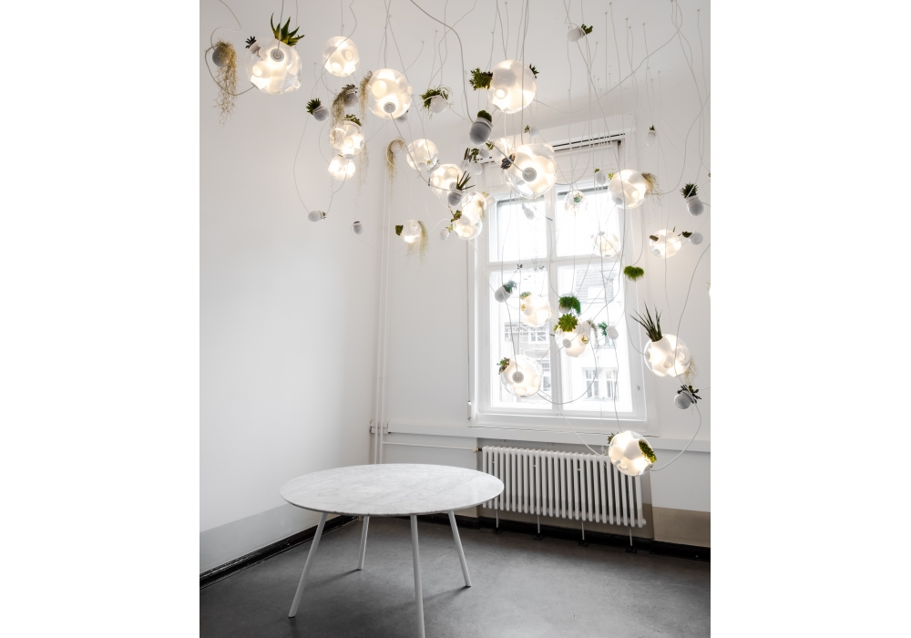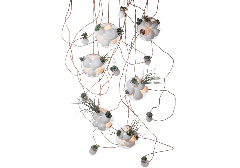 38 est la série de lampes à suspension conçue par Omer Arbel pour Bocci. La série 38 porte la technique artisanale développée pour la série 28 au plus haut niveau. Une grande sphère de verre est fabriquée en soufflant au hasard diverses cavités à l'intérieur. Plusieurs de ces cavités satellites sont suffisamment profondes pour contenir de la terre et des plantes, tandis que d'autres servent d'éléments d'éclairage. Chaque sphère contient deux ou trois luminaires et une ou deux plantes. Grâce à l'artisanat, le diamètre, la taille et le nombre de cavités satellites peuvent varier. Disponible en différentes versions.