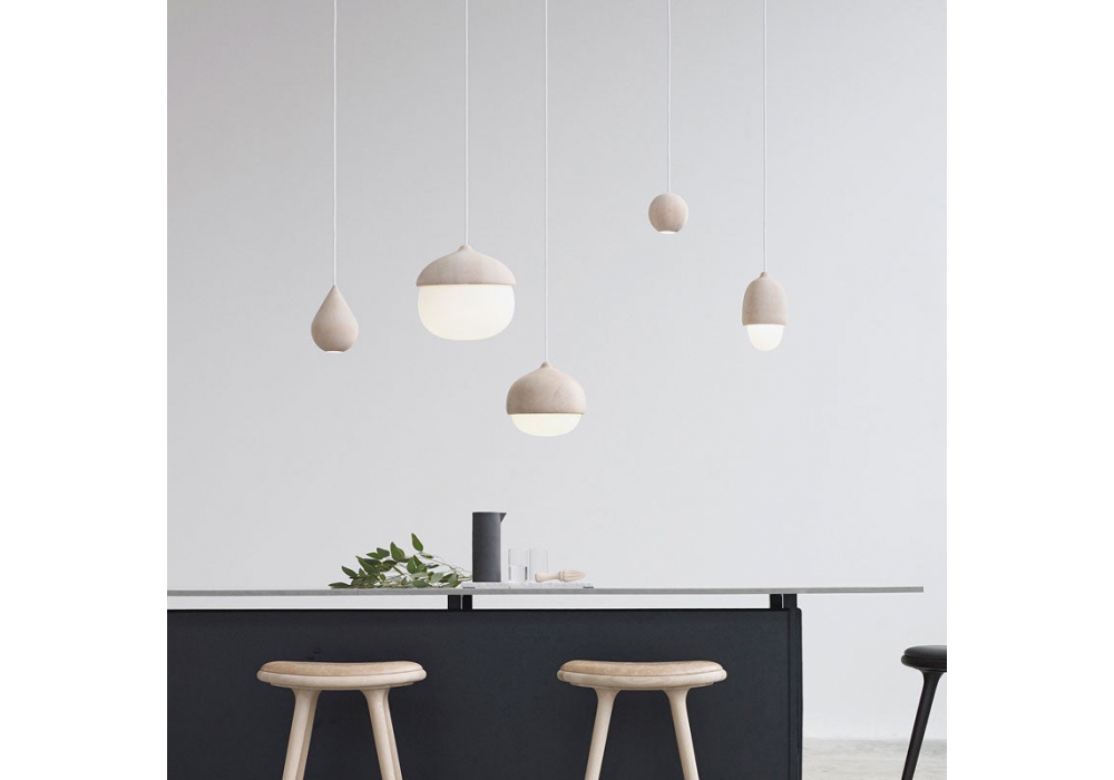 Terho Pendel conçu par Maija Puoskari pour Mater est une belle lampe de suspension disponible en 3 différentes dimensions: petit, moyen et grand. Inspiré par la nature, Terho signifie "glands" en finnois et se réfère simplement à la forme organique et attrayante de glands dans la nature. La chaleur et la beauté du bois d'aulne naturel combiné avec le verre opale le fait aussi contemporain que intemporel.