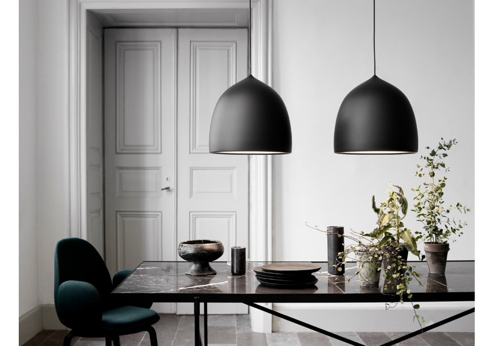 Suspence™ conçue par GamFratesi pour Fritz Hansen est une suspension réalisée avec un abat-jour en aluminium laqué mat et un câble en PVC de couleur assortie. Disponible en différentes finitions et dimensions.