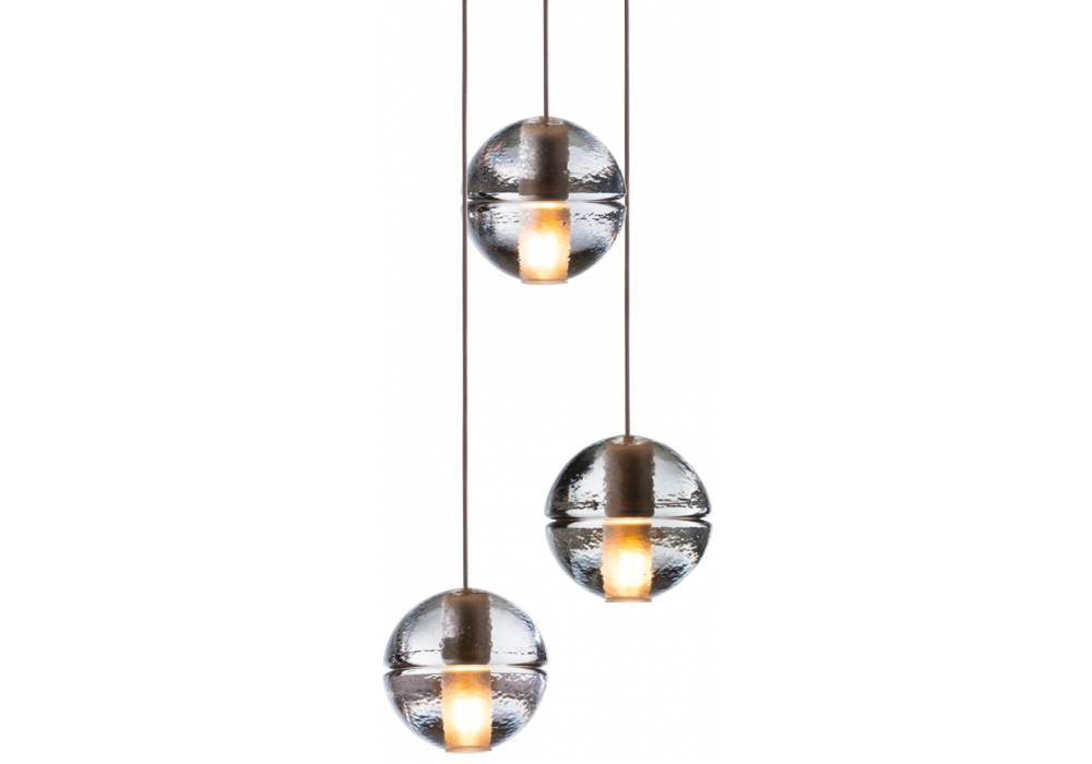 14.3 de la série 14 conçue par Omer Arbel pour Bocci est une lampe à suspension avec trois sphères en verre. Chaque sphère est en verre borosilicaté soufflé. A l'intérieur se trouve une cavité qui abrite une LED basse tension ou une lampe au xénon. Le verre est disponible en couleur claire, grise ou ambrée.