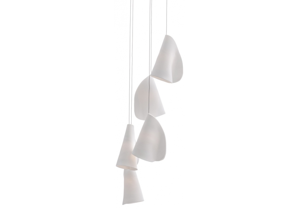 21.5 de série 21 conçue par Omer Arbel pour Bocci est une lampe de suspension avec cinq pendentifs. Chaque pendentif est réalisé avec de fines feuilles de porcelaine qui se enveloppent à un diffuseur en verre borosilicate. Le résultat est un produit unique. Chaque pendentif prend dans un contexte plus large, une forme sculpturale.