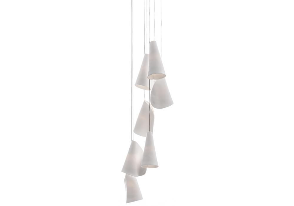 21.7 de la série 21 conçue par Omer Arbel pour Bocci est une lampe à suspension à sept pampilles. Chaque suspension individuelle est faite de fines feuilles de porcelaine qui s'enroulent autour d'un diffuseur en verre borosilicaté. Le résultat est un produit unique. Chaque pendentif prend une forme sculpturale dans un contexte plus large. Disponible en deux versions 21.7 Cluster et 21.7.