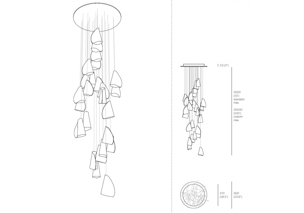 21.26 de la série 21 conçue par Omer Arbel pour Bocci est une lampe à suspension à vingt-six pampilles. Chaque suspension individuelle est faite de fines feuilles de porcelaine qui s'enroulent autour d'un diffuseur en verre borosilicaté. Le résultat est un produit unique. Chaque pendentif prend une forme sculpturale dans un contexte plus large. Disponible en deux versions Rectangle ou Rond.