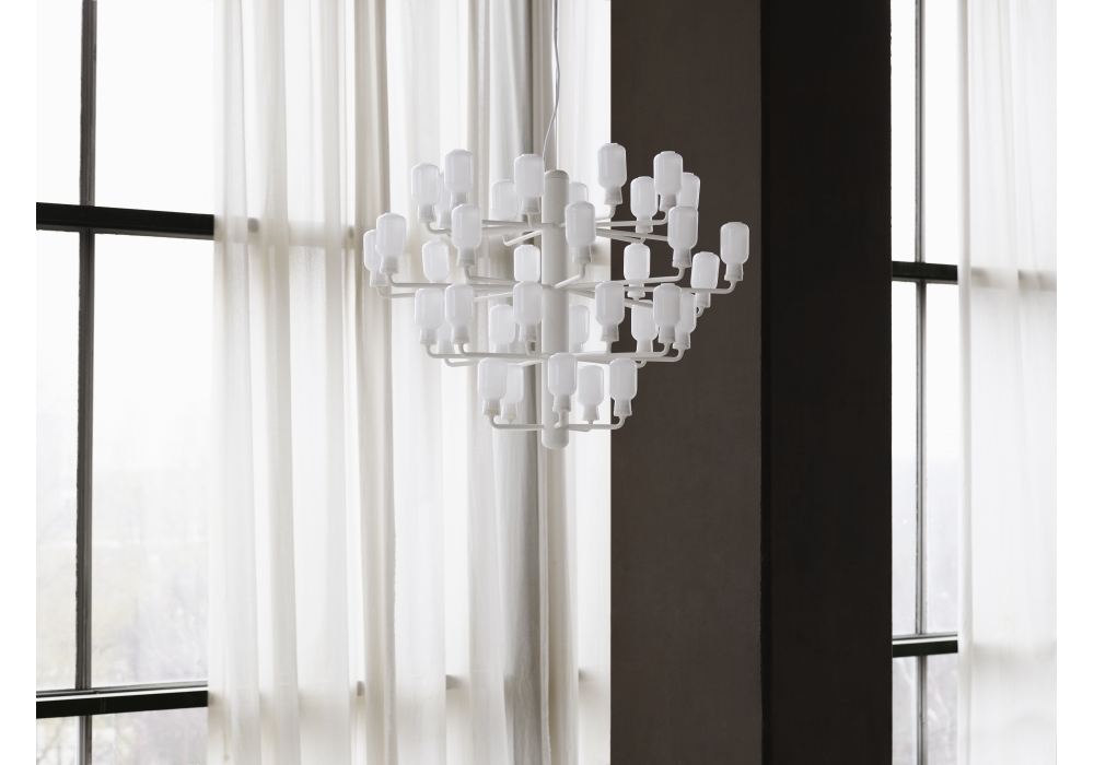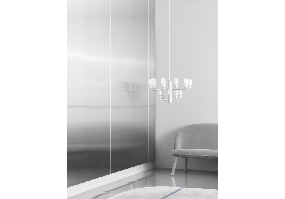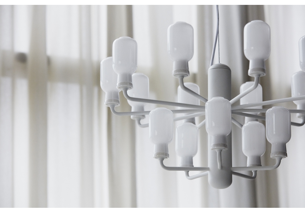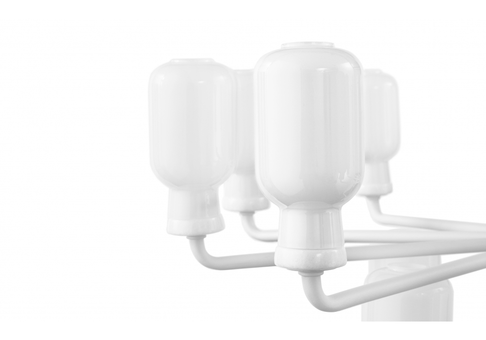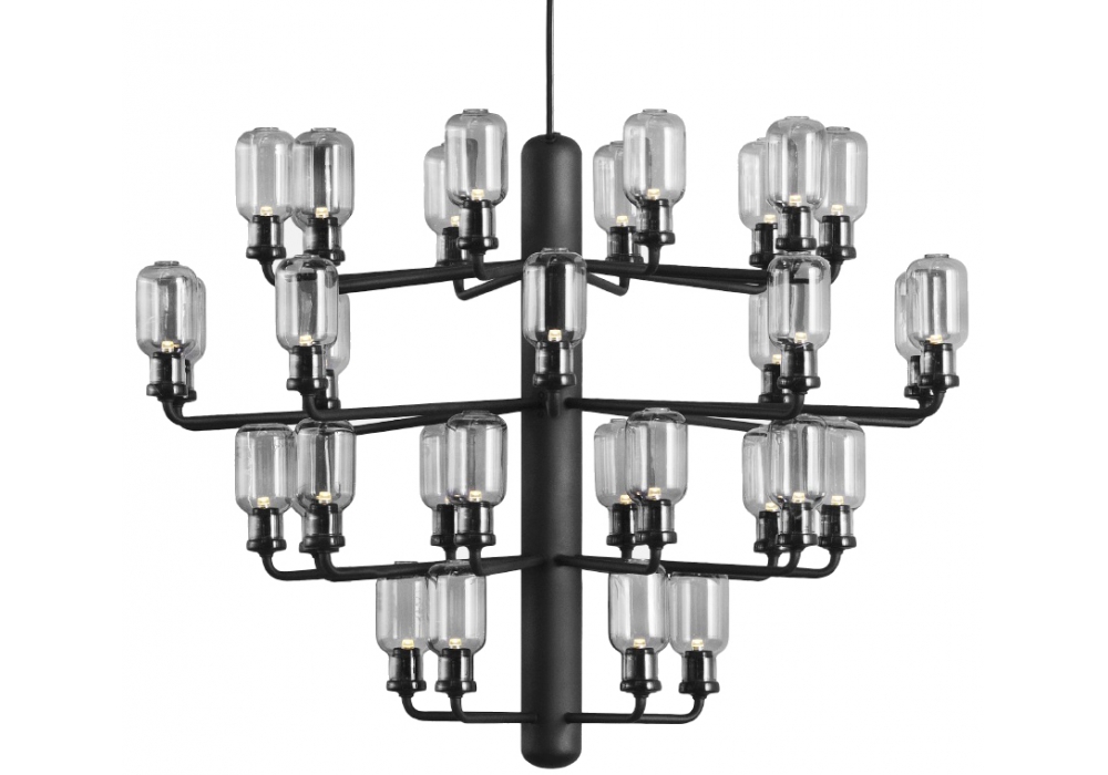Amp, conçu par Simon Legald pour Normann Copenhagen est une lampe à suspension, en métal, marbre et verre. Amp Chandelier est fabriqué avec une combinaison raffinée de marbre et de verre clair et se compose d'un cylindre central en acier, à partir duquel se ramifient des bras courts, où sur chaque bras se trouve un diffuseur en verre cylindrique, où se trouve une source de lumière LED (non incluse). Amp est disponible en trois finitions différentes et en deux tailles.