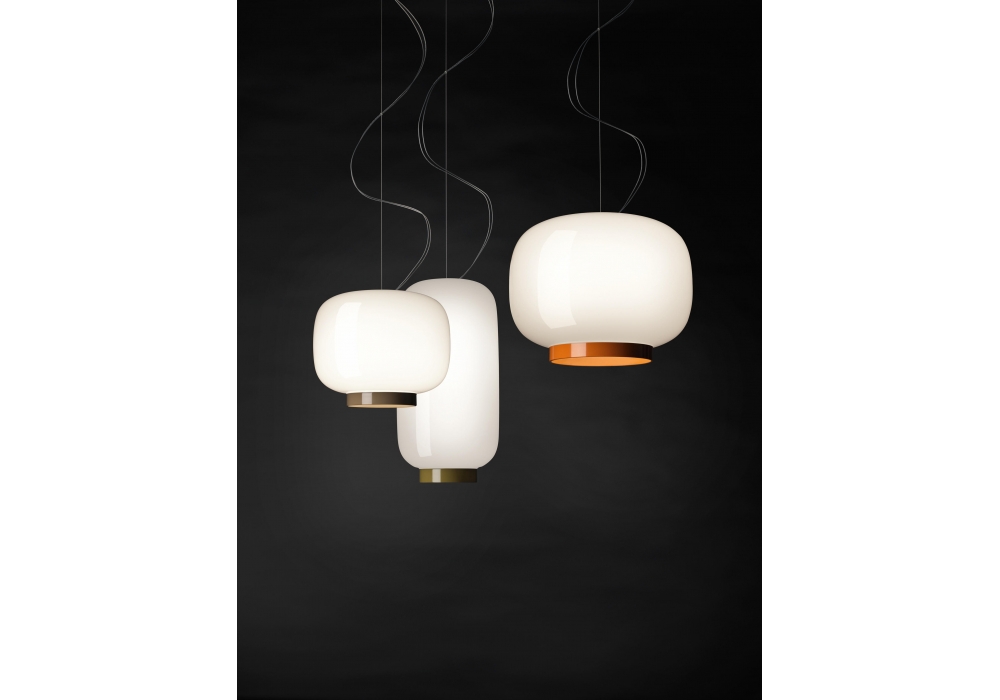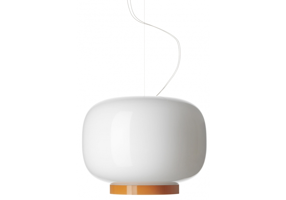 Chouchin 1 Reverse conçue par Ionna Vautrin pour Foscarini est une lampe à suspension circulaire en verre soufflé blanc avec bord peint en orange. la source lumineuse adoptée est avec une connexion LED E27 disponible en différentes versions.