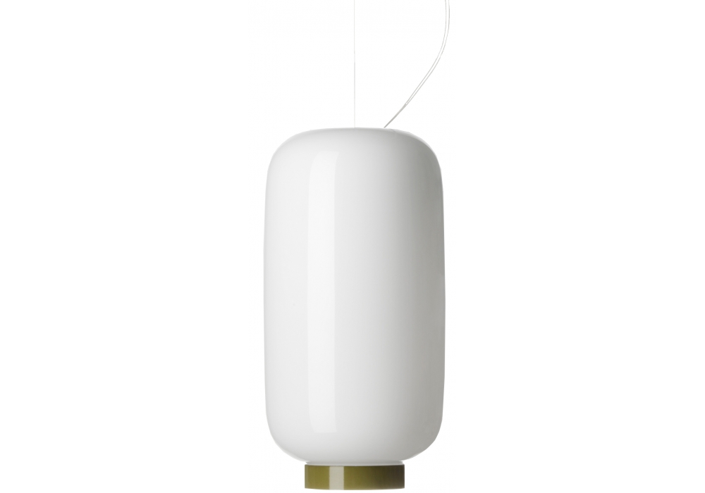 Chouchin 2 Reverse conçue par Ionna Vautrin pour Foscarini est une lampe à suspension cylindrique en verre soufflé blanc avec bord peint en vert. la source lumineuse adoptée est avec une connexion LED E27 disponible en différentes versions.