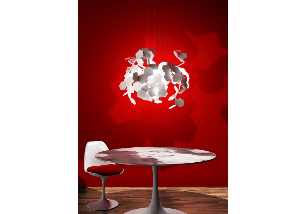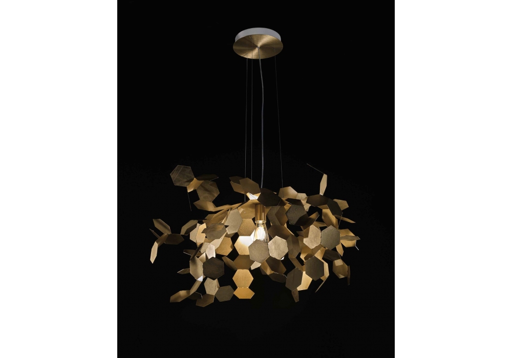 Andromeda conçue par Paolo Ulian pour Zava est une suspension réalisée en aluminium. Il peut prendre des configurations infinies selon le positionnement des éléments hexagonaux / diffuseurs. La verrière est de couleur aluminium pour la version peinte et assortie à la lampe pour la version laiton. Disponible en différentes dimensions.