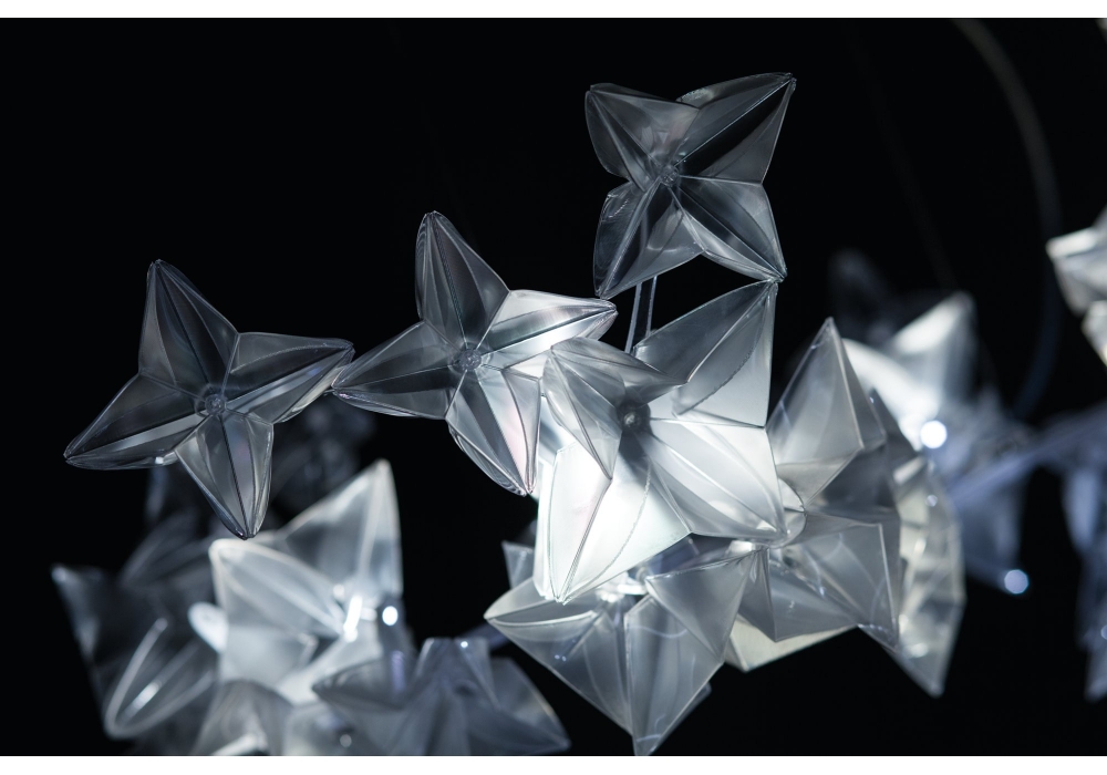 Hanami conçue par Adriano Rachele pour Slamp est une lampe à suspension entièrement réalisée en Lentiflex, polycarbonate et acier inoxydable. La source lumineuse utilisée est de type LED dimmable avec un câble d'alimentation rouge ou transparent. Hanami est disponible en différentes tailles.