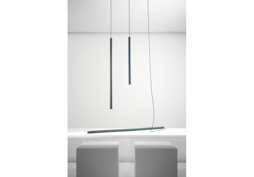 Bull conçue par Franco Zavarise pour Zava est une lampe de suspension en fer ou en laiton peint mat. Le Driver est inséré dans la rosace du plafond. Disponible en différentes finitions et dimensions.