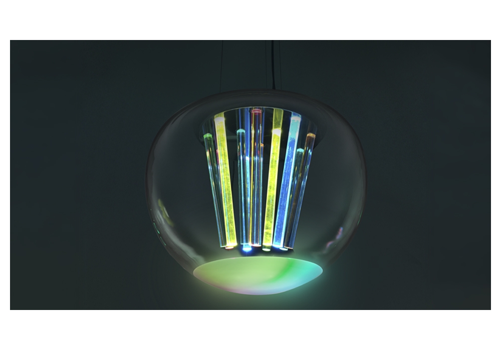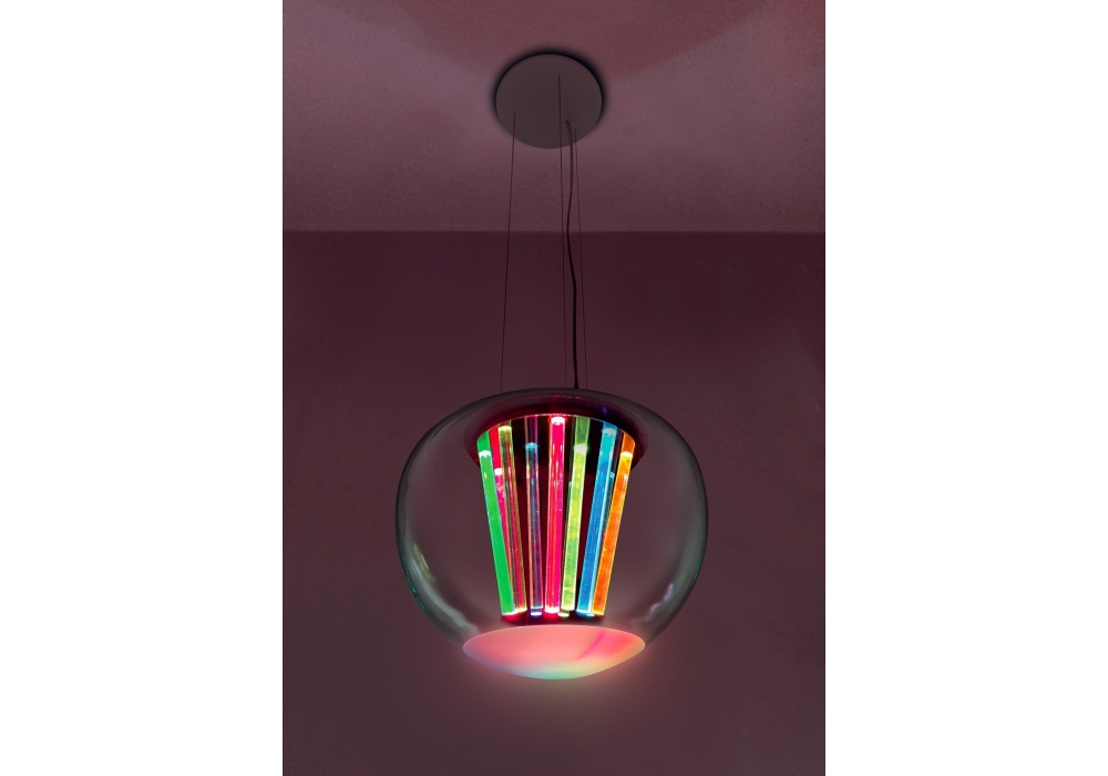 Spectral Light conçue par Philippe Rahm pour Artemide est une lampe à suspension avec structure porteuse en métal chromé et diffuseur sphérique en verre soufflé transparent. La source lumineuse adoptée est de type LED avec système de gradation Push.