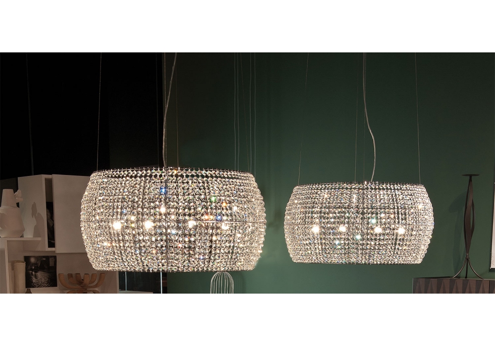 Kidal conçue par Emanuele Zenere pour Cattelan Italia est une suspension avec structure en acier chromé et diffuseur réalisé avec pampilles en verre. Disponible en 3 dimensions et dans les versions 220V et 110V. Ampoule incluse. Il est possible d'intégrer un câble additionnel de 2mt.