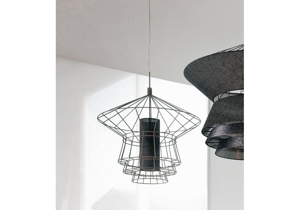 Zeppelin conçue par Oriano Favaretto pour Cattelan Italia est une suspension avec structure en nickel ou acier laqué noir opaque. Diffuseur revêtue en tissu disponible en ivoire, brun ou noir. Disponible en deux dimensions et en versions 220V ou 110V. Il est possible d'intégrer un câble supplémentaire de 1 mètre. Ampoule non incluse.