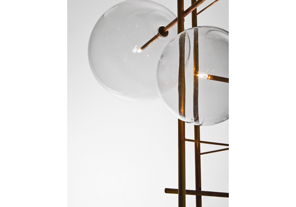 Bolle Tela conçue par Massimo Castagna pour Gallotti&Radice est une lampe à suspension avec lumière LED dimmable. 8 boules en verre soufflé transparent. Disponible aussi dans la version avec 6 boules. Parties métalliques en laiton bruni à la main. Le laiton bruni à la main est naturellement taché et pas uniforme. Câble de 4mt inclus. Ampoules (LED) inclues.