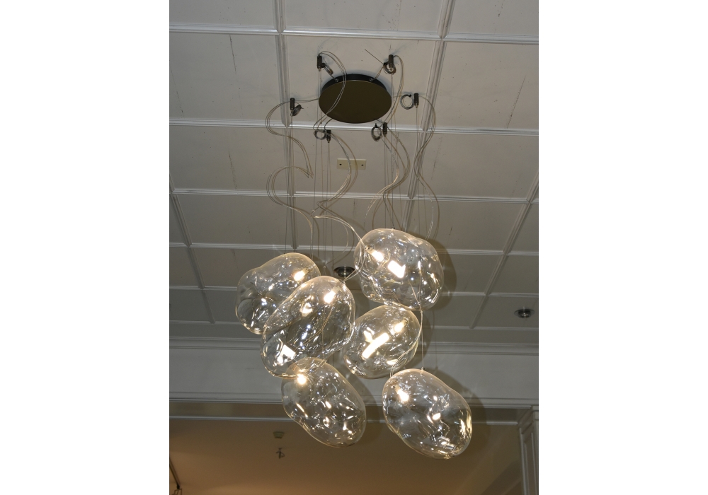 Cloud conçue par Oriano Favaretto pour Cattelan Italia est une suspension avec abat-jour en verre et rosette en acier Nickel satiné. Disponible en différentes compositions.