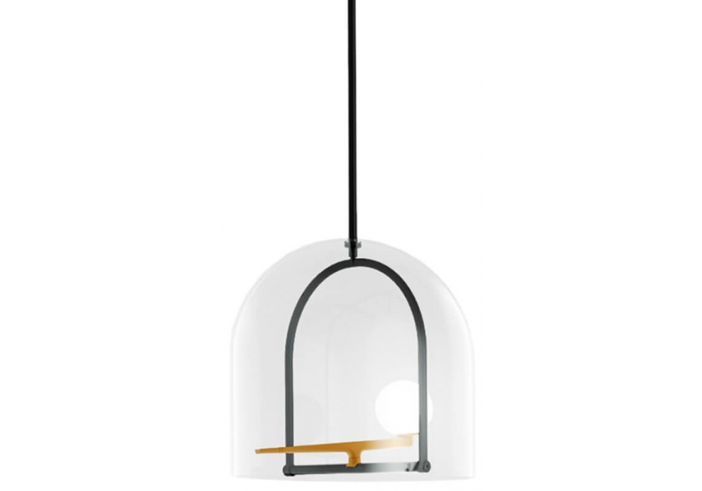 Yanzi conçue par Neri&Hu pour Artemide est une lampe à suspension structurée par un capuchon en verre qui renferme un corps lumineux avec une structure en laiton et acier. Le diffuseur est sphérique en verre soufflé blanc avec source de lumière LED avec système de gradation Push.
