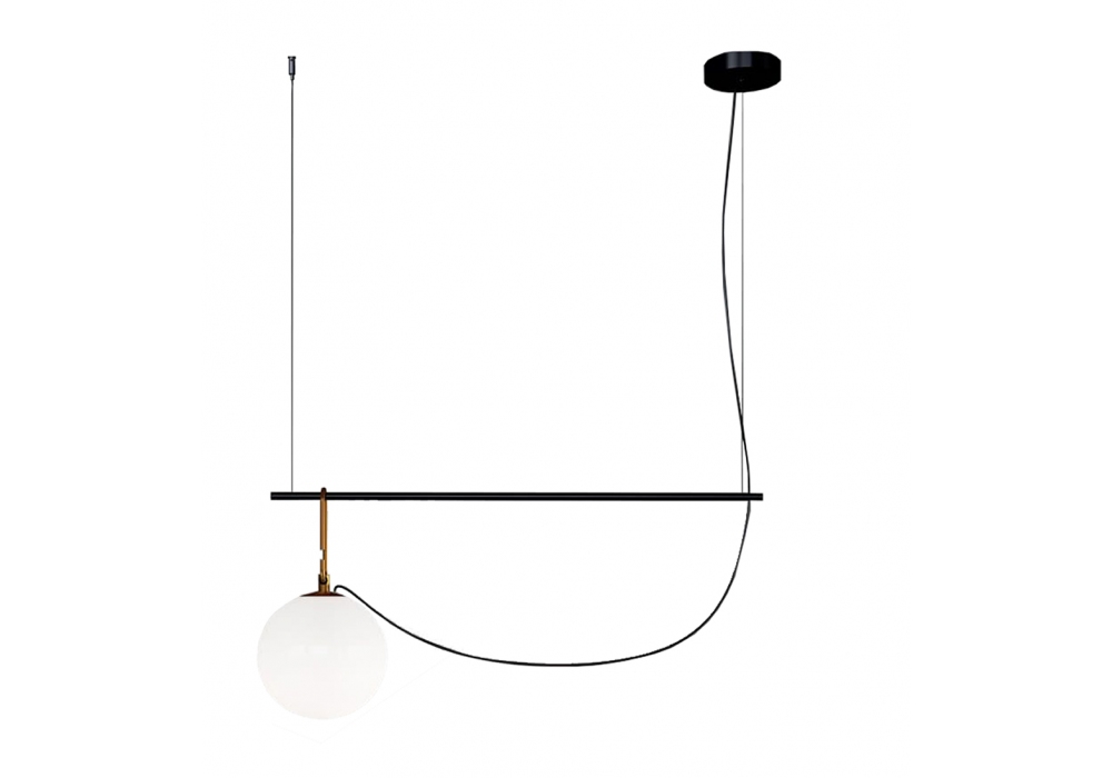 NH S2 22 conçue par Neri&Hu pour Artemide est une lampe à suspension avec une barre de support en acier et un crochet de support en laiton. Le diffuseur sphérique est en verre soufflé blanc et adopte une source de lumière LED à intensité variable.