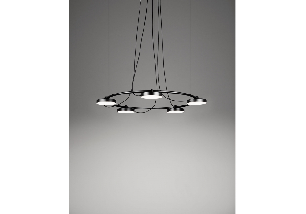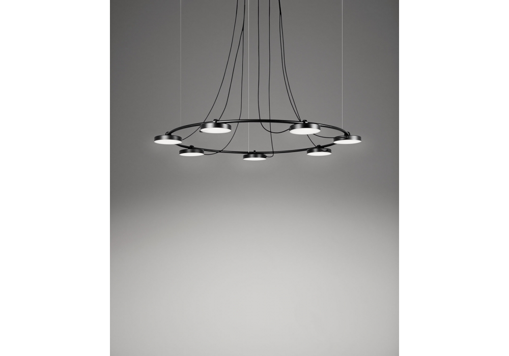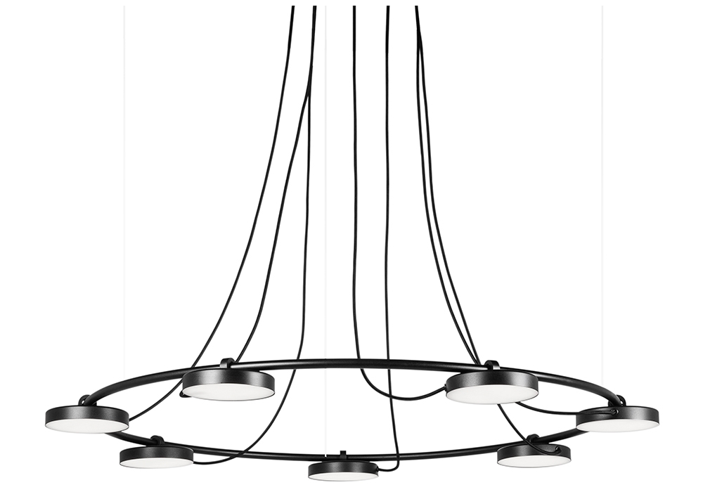 Aro conçue par Jordi Blasi pour Estiluz est une lampe à suspension circulaire entièrement réalisée en métal peint en noir. Les diffuseurs adoptent une source lumineuse de type LED avec un système de gradation 0-10V. Aro est disponible en différents modèles.