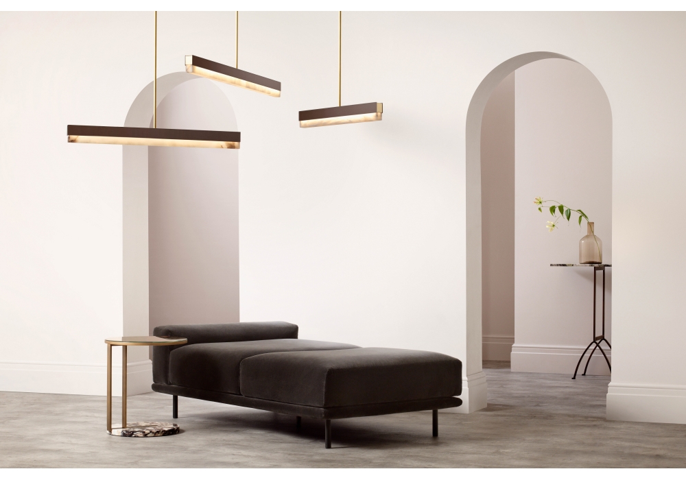 Artés conçue par CTO Lighting est une suspension LED réalisée en bronze avec des détails en laiton satiné ou entièrement en laiton satiné et abat-jour en albâtre poli. Disponible en différentes dimensions.