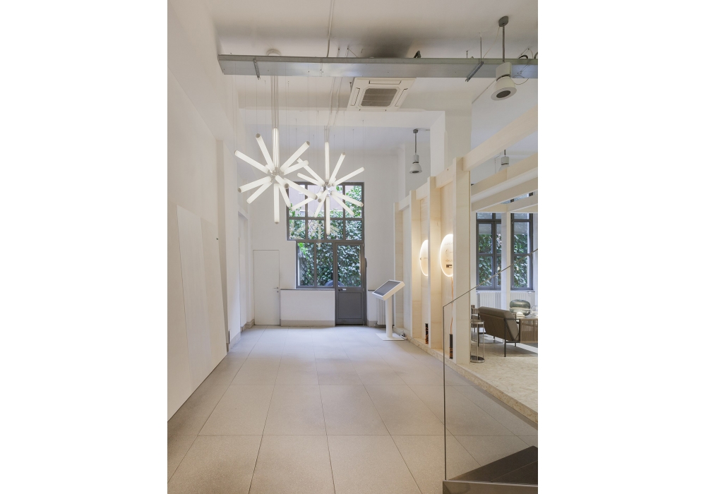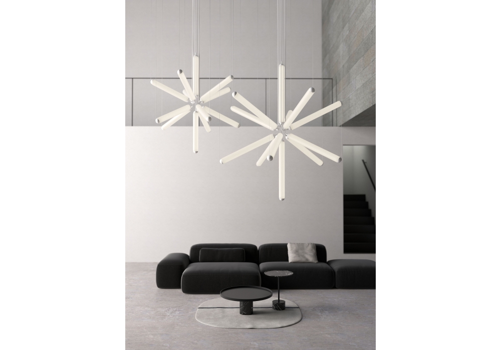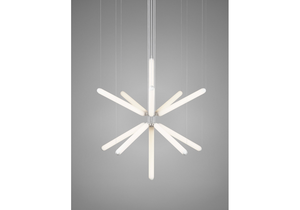 Puro Sparkle conçue par Lucie Koldová pour Brokis est une lampe à suspension en verre et métal enduit de poudre. Les multiples tubes rayonnent vers l'extérieur dans une lumière diffuse et adoptent une source lumineuse LED dimmable dans différentes versions. Puro Sparkle est disponible en différentes tailles et finitions.