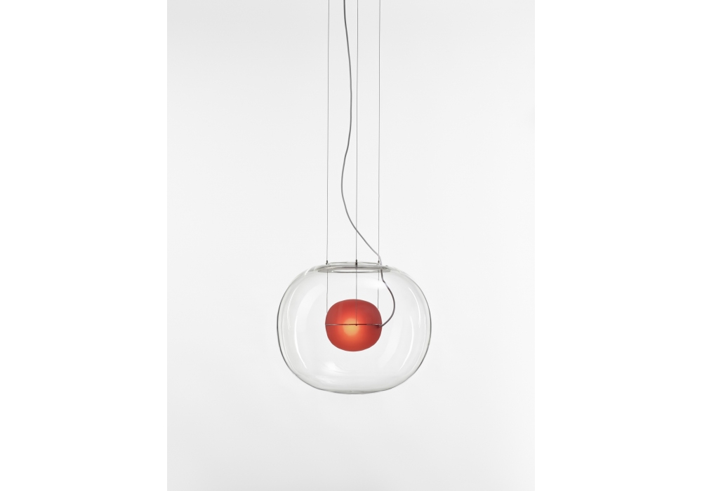 Big-One conçue par Lucie Koldová pour Brokis est une lampe à suspension de forme arrondie en verre soufflé. Le diffuseur interne est un noyau en verre soufflé et masque une source lumineuse LED dimmable dans différentes versions. Big-One est disponible en différentes tailles et finitions.