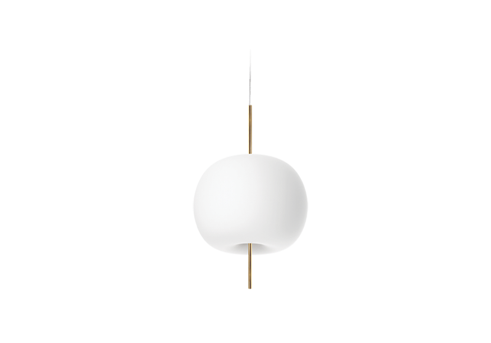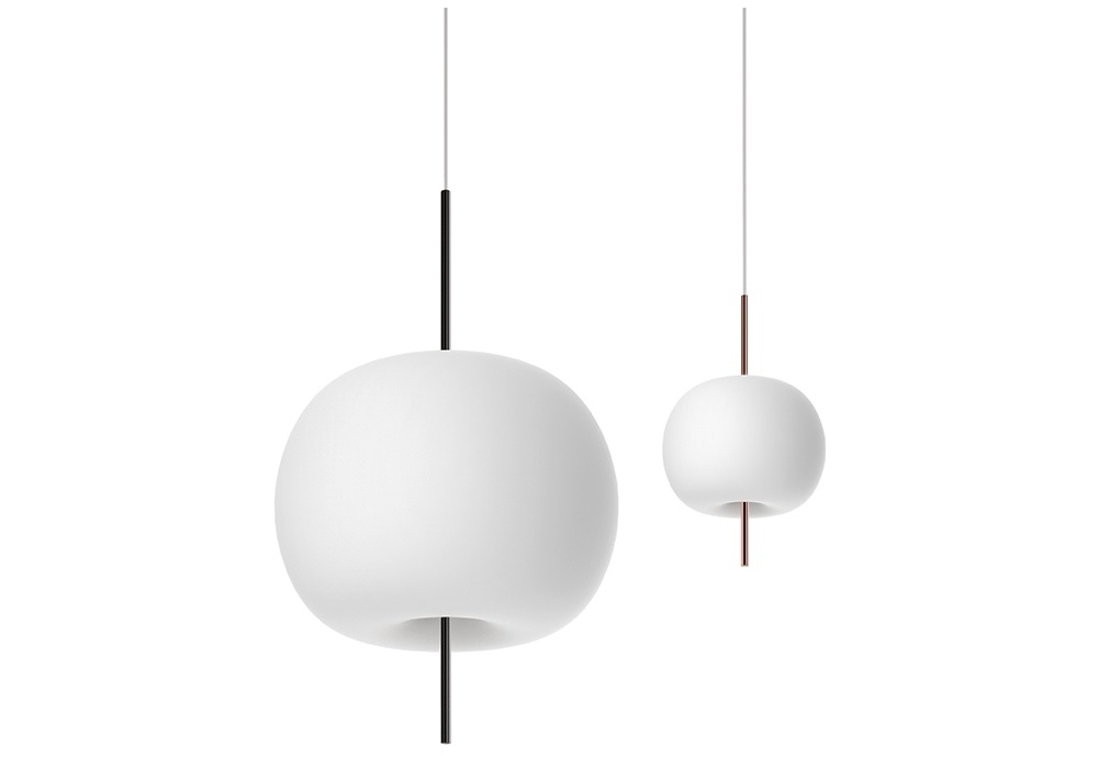 Kushi conçue par Alberto Saggia & Valerio Sommella pour Kundalini est une suspension avec diffuseur en verre opalin soufflé double couche et corps en métal verni disponible en finitions: noir, cuivre et laiton. Disponible en deux dimensions.