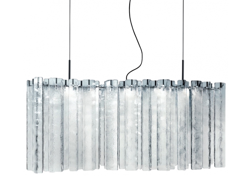 Shield conçue par Giancarlo Bosio & Centro Ricerche Giorgetti est une lampe de suspension avec base en métal bruni qui soutient des feuilles de verre coulé de forte épaisseur à surface martelée. Disponible en verre transparent ou fumé. Disponible aussi en version chandelier. Éclairage LED dimmable.