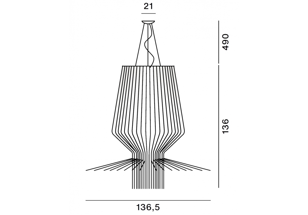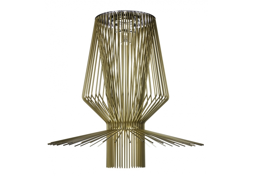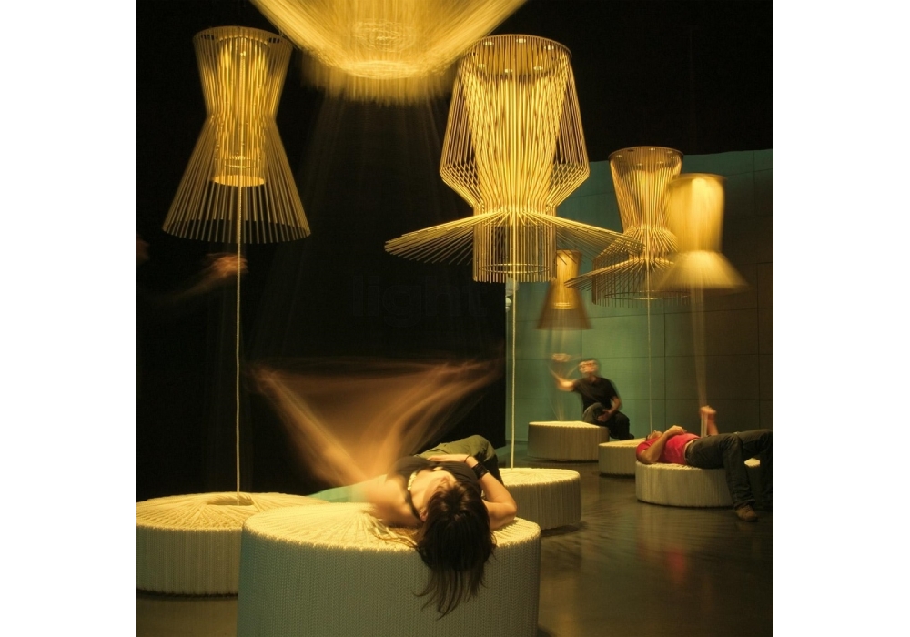 Allegro Assai conçue par Atelier Oï pour Foscarini est une lampe à suspension structurée par des tiges soigneusement pliées en aluminium peint en or et métal chromé. La source lumineuse utilisée est de type LED dimmable ou halogène.