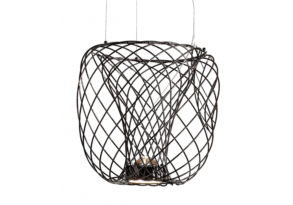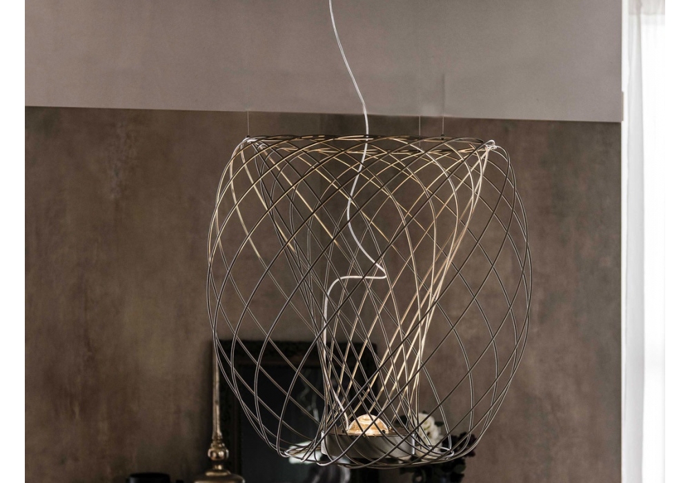 Twister conçue par Piervittorio Prevedello pour Cattelan Italia est une lampe à suspension avec structure en acier peint en titane ou en chrome noir. Eclairage led.