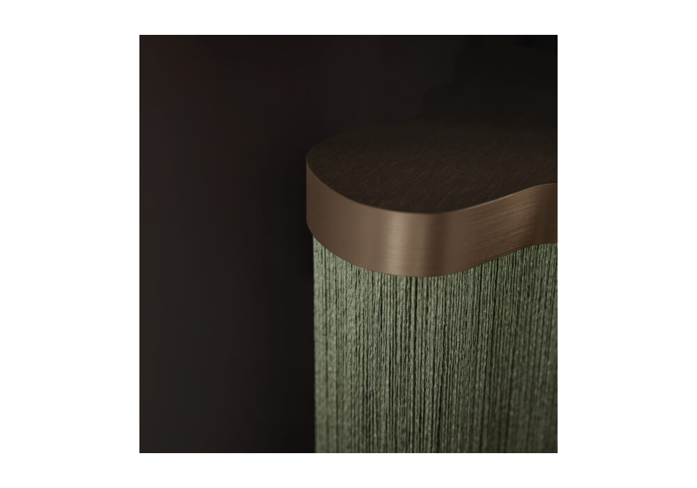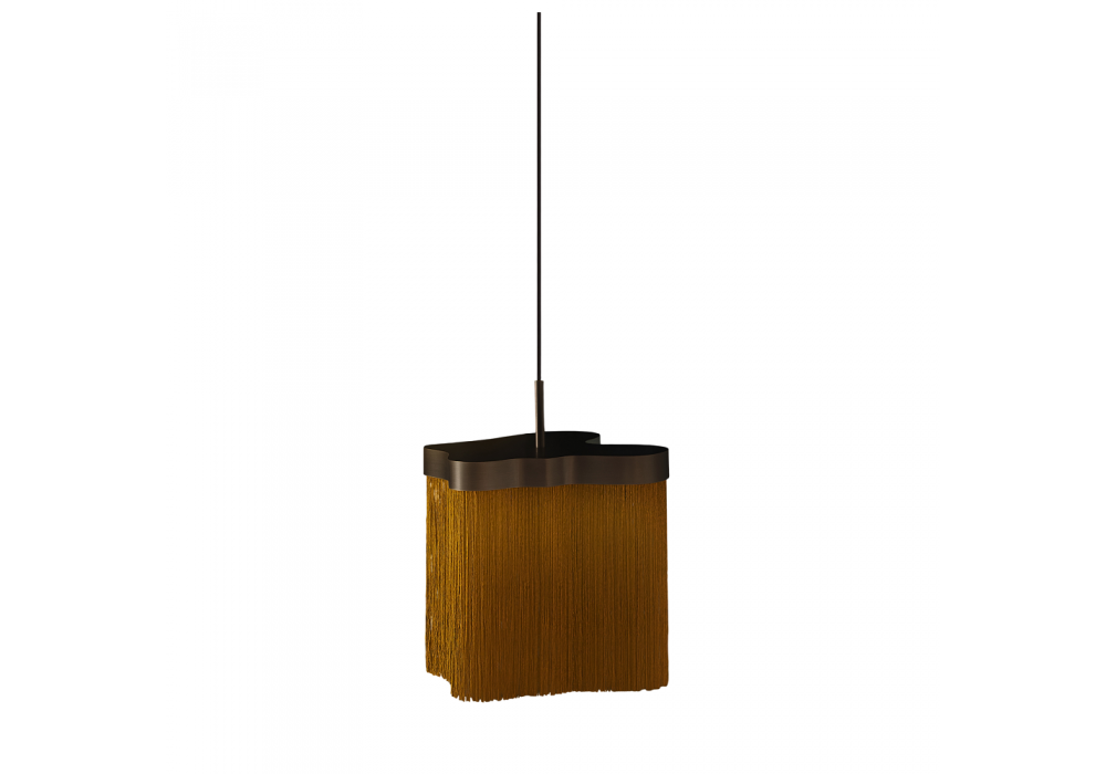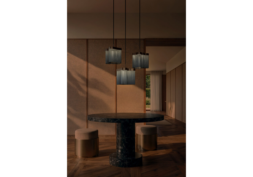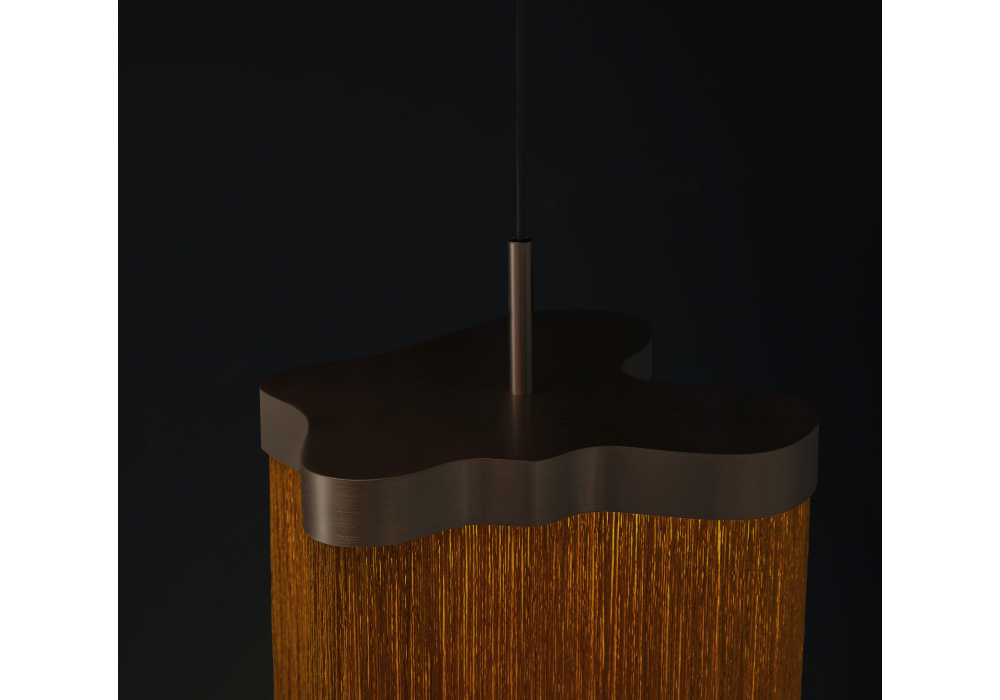 Arcipelago conçue par Servomuto pour Contardi est une suspension dotée d'une structure en bronze et de franges ignifugées en Trevira CS. Elle est équipée d'un panneau LED sur mesure à intensité variable.