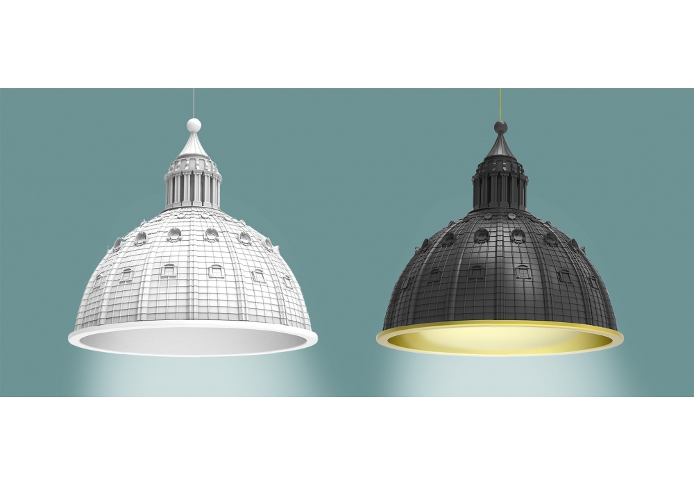 Cupolone conçue par AMeBe pour Seletti est une lampe à suspension. Réalisé en deux finitions (résine blanche ou grise) c'est une reproduction du dôme de San Pietro.