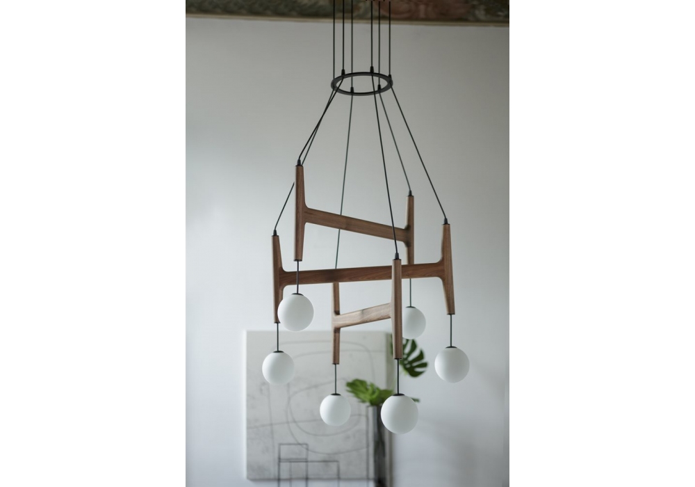 Astra conçue par David Dolcini pour Porada est une lampe à suspension en noyer canaletta massif et des diffuseurs en verre opale brillant. Câble en caoutchouc de silicone finition noir mat. Hauteur des câbles réglable lors de l'installation. Rosace de plafond et bague d'espacement en métal peint noir mat.