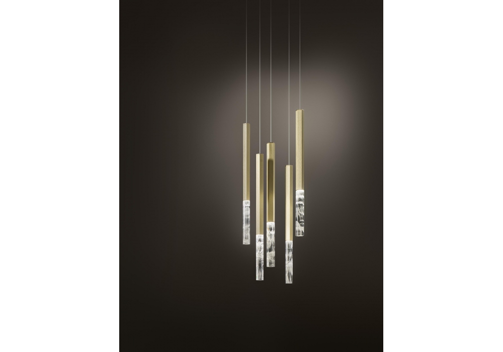 Shine Vertical Plumage conçue par Michele Marcon pour Olev est une lampe à suspension LED en laiton et plexiglas. Driver inclus.
