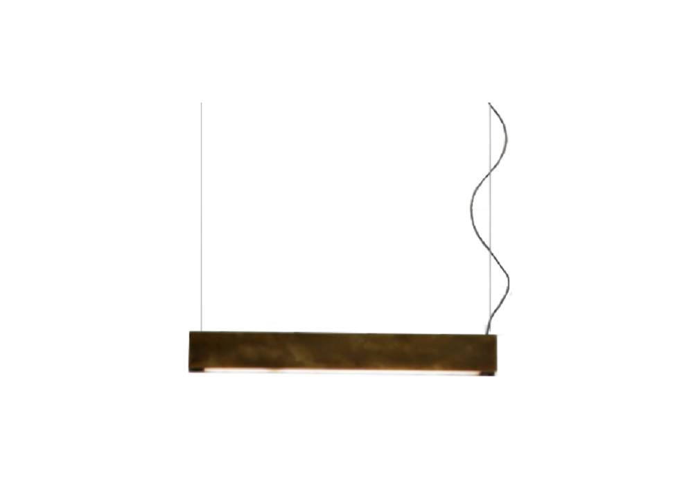 Code 7381 /1-00 P conçue et produite par Ufficio Tecnico MMLampadari est une lampe à suspension composée de deux lignes lumineuses, avec une structure interne en noir mat et une finition externe disponible en trois variantes: laiton oxydé, fer décapé, revêtement cuir noir.