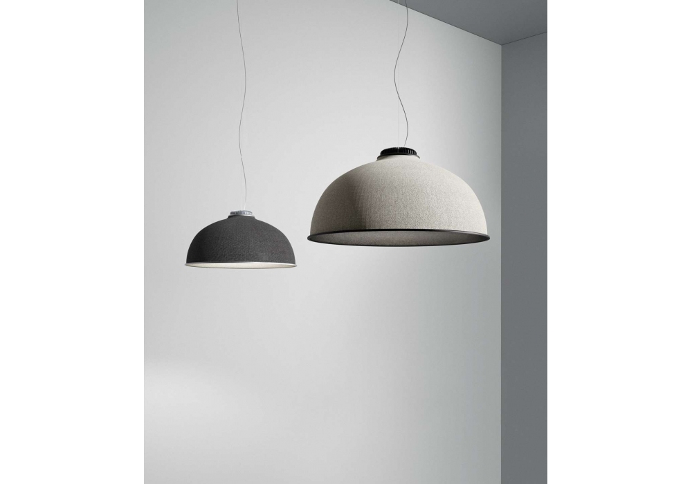 Farel conçue par Diego Sferrazza pour Luceplan est une suspension en aluminium et abat-jour en matériau acoustique et tissu ignifuge. Anneaux et radiateur en aluminium peint. Disponible en différentes finitions.