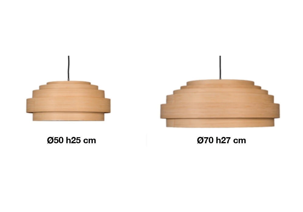 Thin Wood conçue par Ay Illuminate est une lampe à suspension avec diffuseur en bambou, disponible en deux tailles (moyenne et grande).