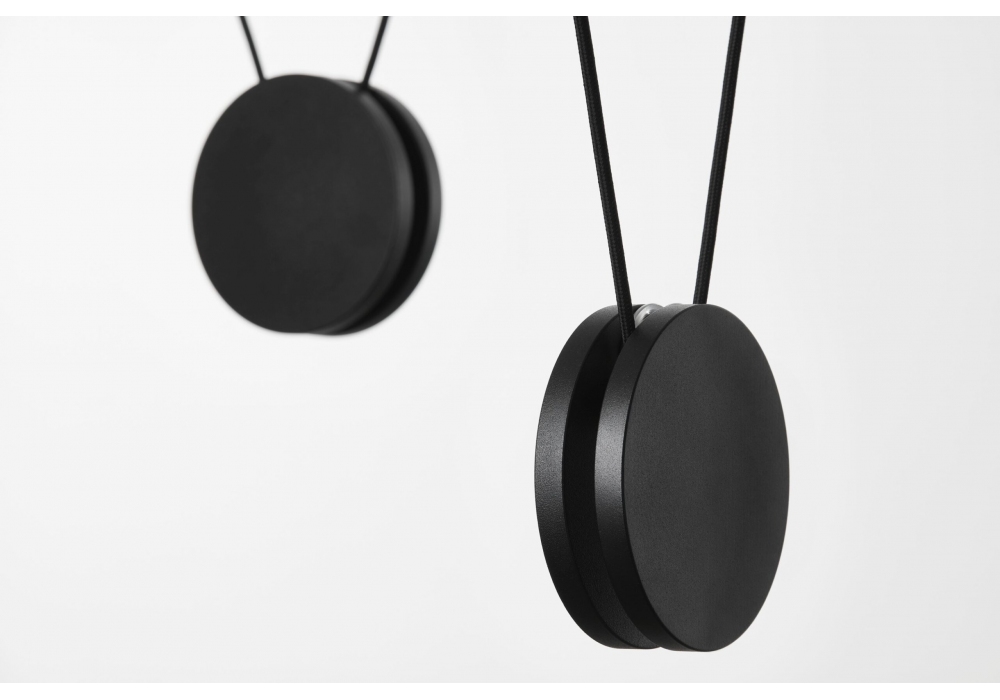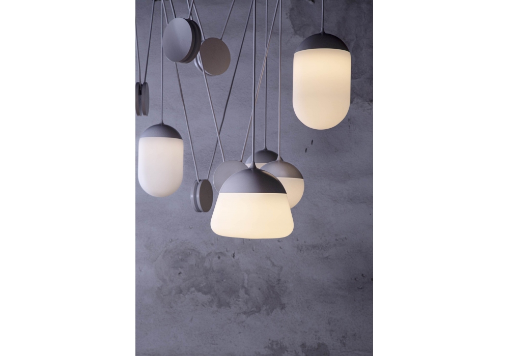Planets conçue par Vrtiška & žák pour Brokis est une collection de lampes suspendues avec structure en fer avec revêtement en poudre noir mat ou blanc. La partie en verre est disponible gris fumée ou opale triplex, gravée à l'acide sur les deux faces. Planets est un ensemble de lampes modulables à 360° en hauteur, taille, modèle et nombre de diffuseurs.
