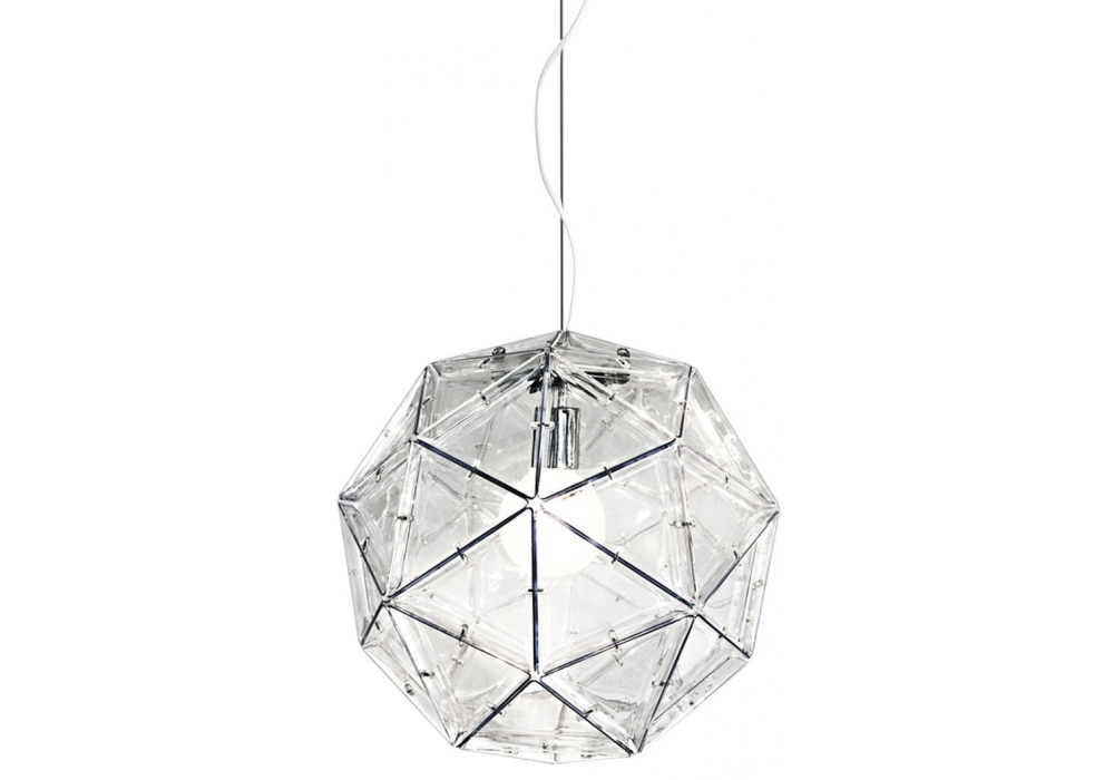 Poliedro conçue par Elio Martinelli pour Martinelli Luce est une lampe à suspension avec structure en métal chromé. Le diffuseur est en méthacrylate structuré par de multiples éléments ancrés les uns aux autres, et fait écran à une source lumineuse de type LED.