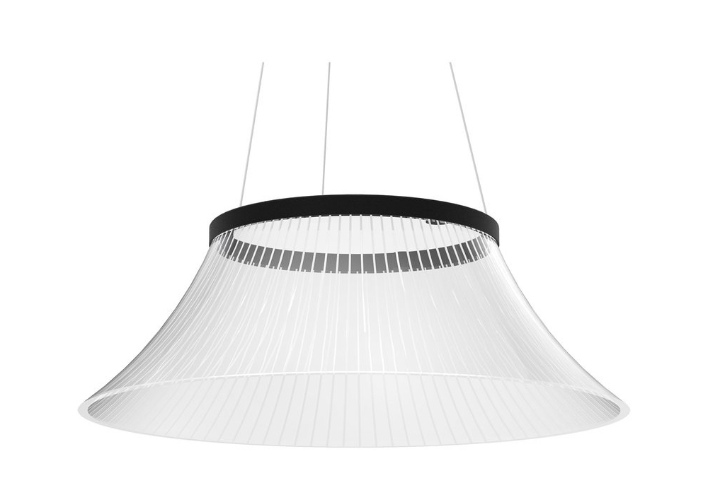 Plissè conçue par Emiliana Martinelli pour Martinelli Luce est une lampe à suspension de forme circulaire avec structure portante en aluminium peint. Le diffuseur est en méthacrylate transparent caractérisé par des signes graphiques réalisés au laser. La source lumineuse retenue est de type LED intégrée.