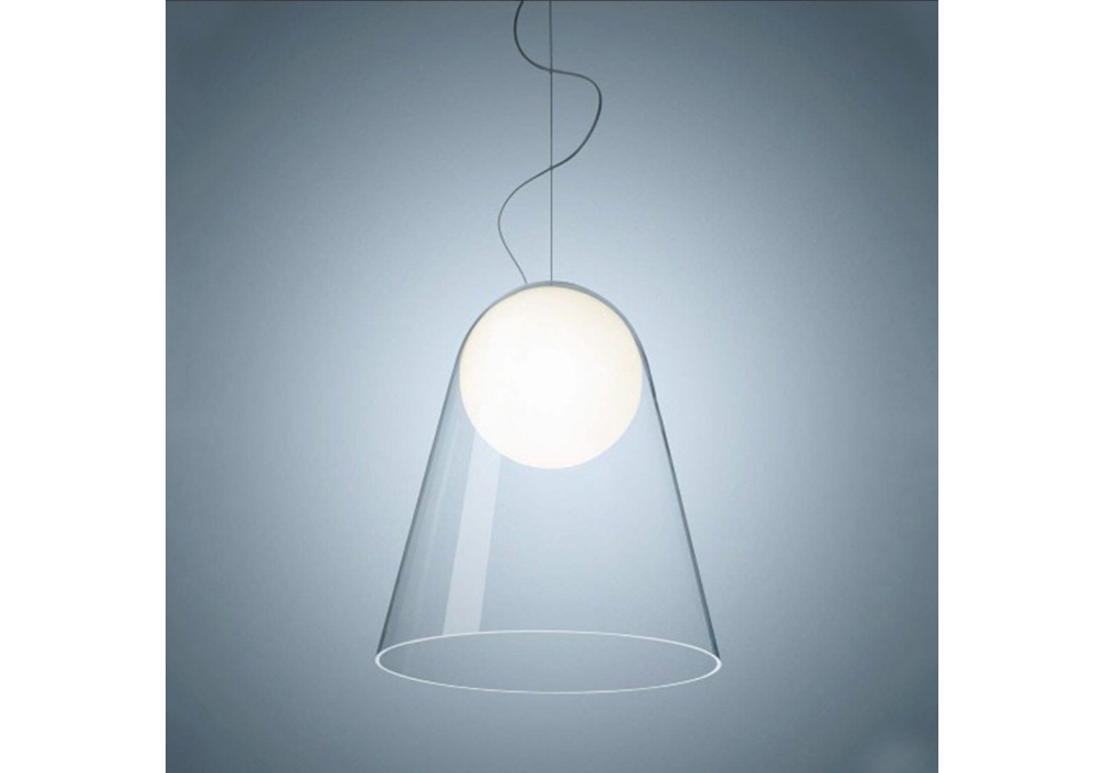 Satellight conçue par Eugeni Quitllet pour Froscarini est une lampe à suspension structurée par un corps en verre transparent en forme de cloche. Le diffuseur est sphérique en verre soufflé blanc opaque et abrite une source lumineuse LED retrofit dimmable.