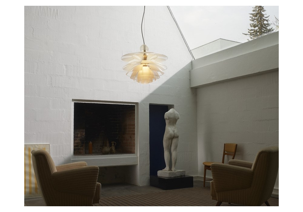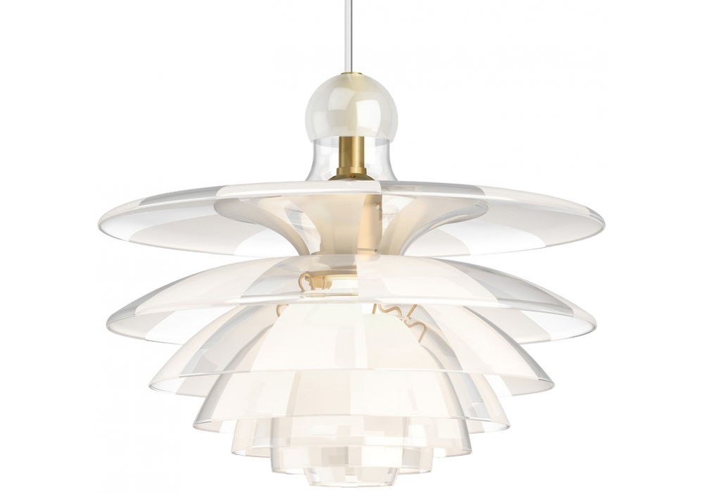 PH Septima conçue par Poul Henningsen pour Louis Poulsen est une lampe à suspension avec cadre de support en laiton non traité. Les diffuseurs sont structurés par une couronne avec sept écrans en verre alternant entre satiné et brillant et protégeant une source lumineuse LED ou halogène avec douille E27.