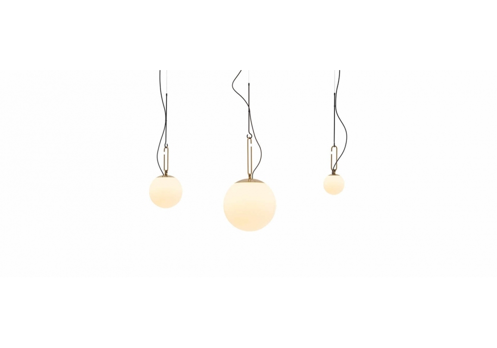Nh conçue par Neri&Hu pour Artemide est une lampe à suspension avec diffuseur sphérique en verre soufflé blanc et structure en acier peint. La source lumineuse adoptée est la LED avec un système dimmable.
