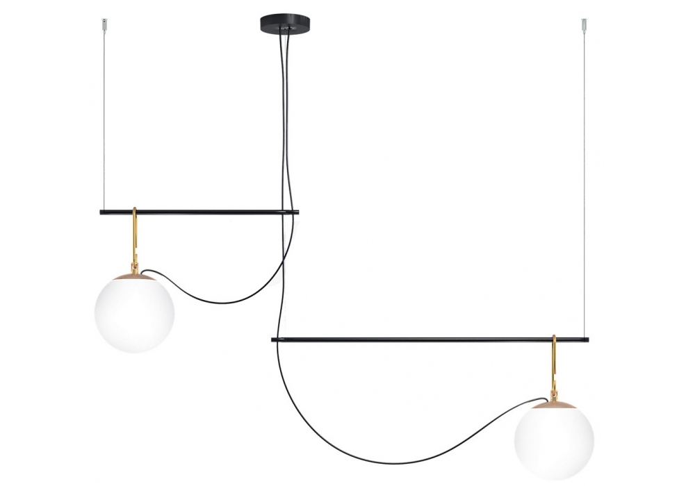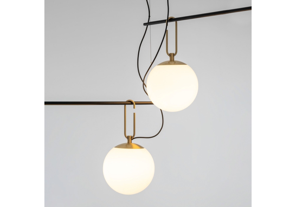 Nh S3 2 Arms firmata da Neri&Hu per Artemide è una lampada a sospensione con due diffusori sferici in vetro soffiato bianco e struttura in tubolare d'acciaio verniciato. La sorgente luminosa adottata è LED con sistema dimmerabile. NH S3 2 Bracci è disponibile in diverse finiture.
