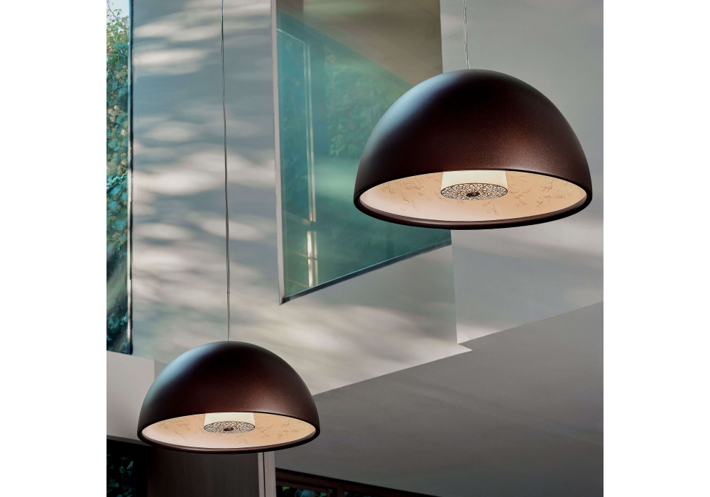 Skygarden 1 conçue par Marcel Wanders pour Flos est une suspension à lumière diffuse. Dôme intérieur en plâtre blanc. Support en alliage d'aluminium. Diffuseur en verre opale soufflé. Frise en acier inoxydable photogravé et étiré. Rosace en polycarbonate de la même couleur que le dôme. Réglable à distance (variateur non inclus). Source LED non incluse.