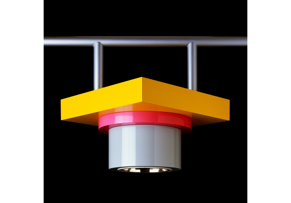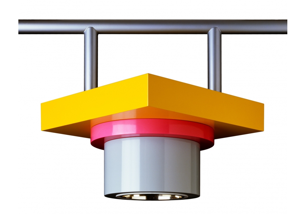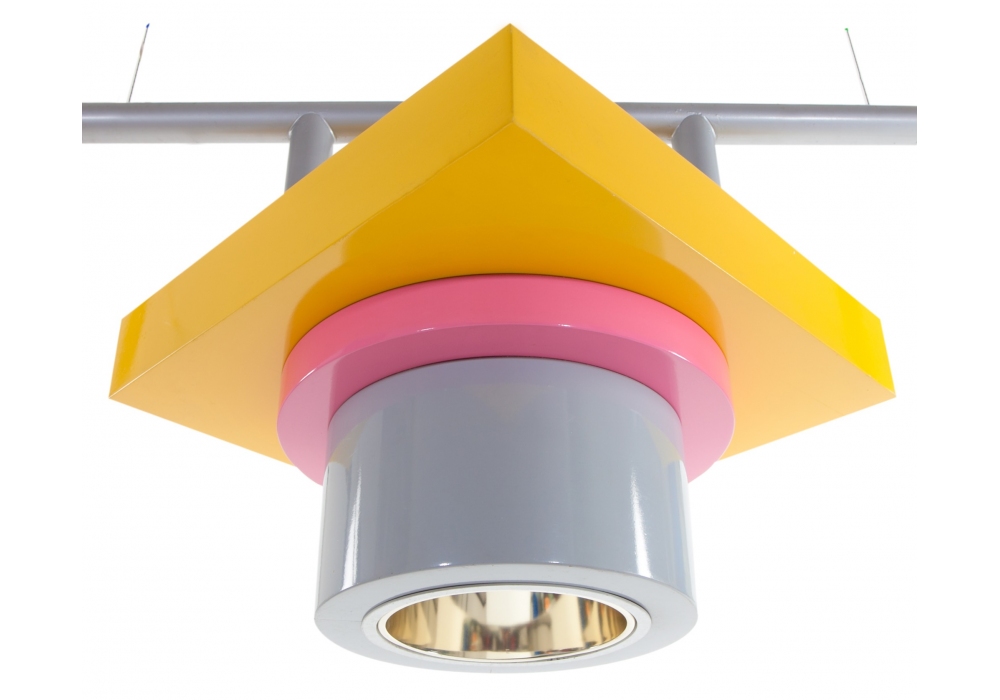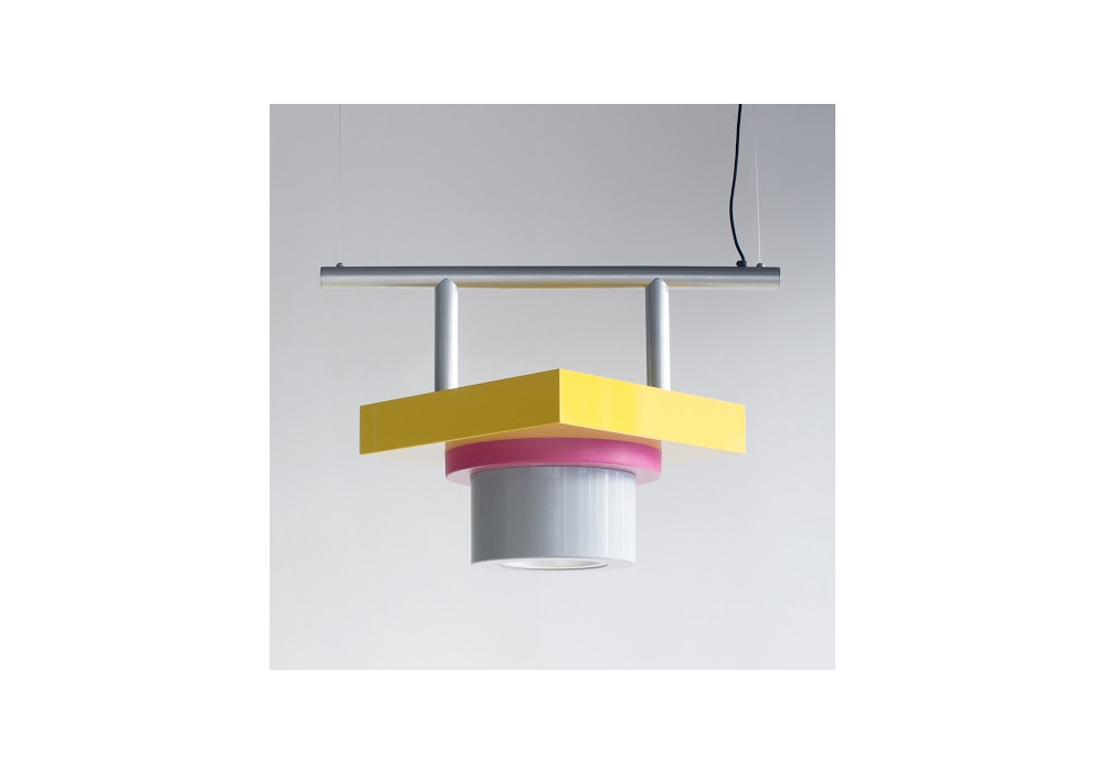 Rossella conçue par Marco Zanini pour Memphis Milano est une suspension en métal. Ampoule E27.