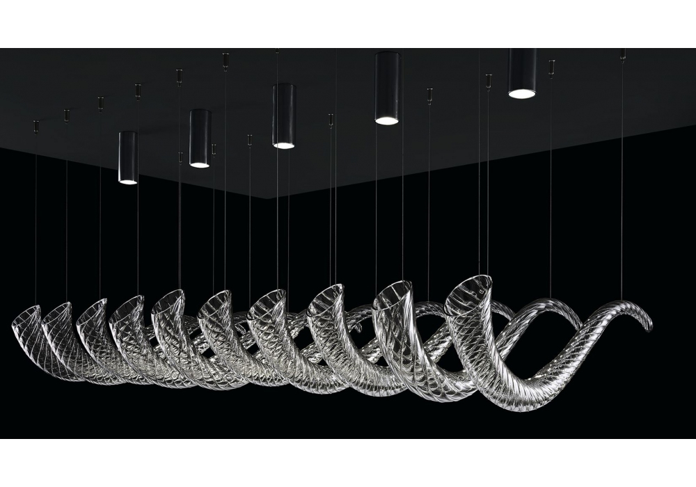 Swing conçue et produite par Barovier & Toso est une lampe à suspension avec une plaque d'ancrage au plafond en métal chromé poli. Les pendentifs sont en cristal vénitien et sont disponibles en différentes finitions. Les carets lumineux adoptés sont de type LED dimmable. Swing est produit dans différents modèles.