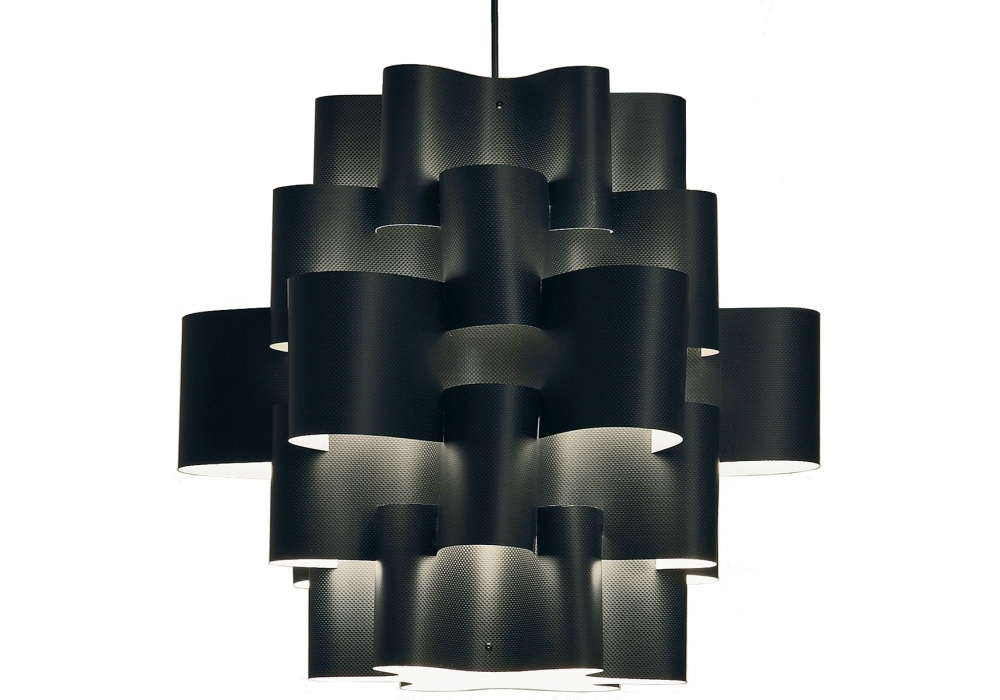 Sun 75 conçue par Brian Rasmussen pour Quadrifoglio Group est une lampe à suspension construite en encastrant 96 fois des feuilles très mince en tissu textile blanc, rouge ou noir. Rosace de plafond en métal peint blanc.