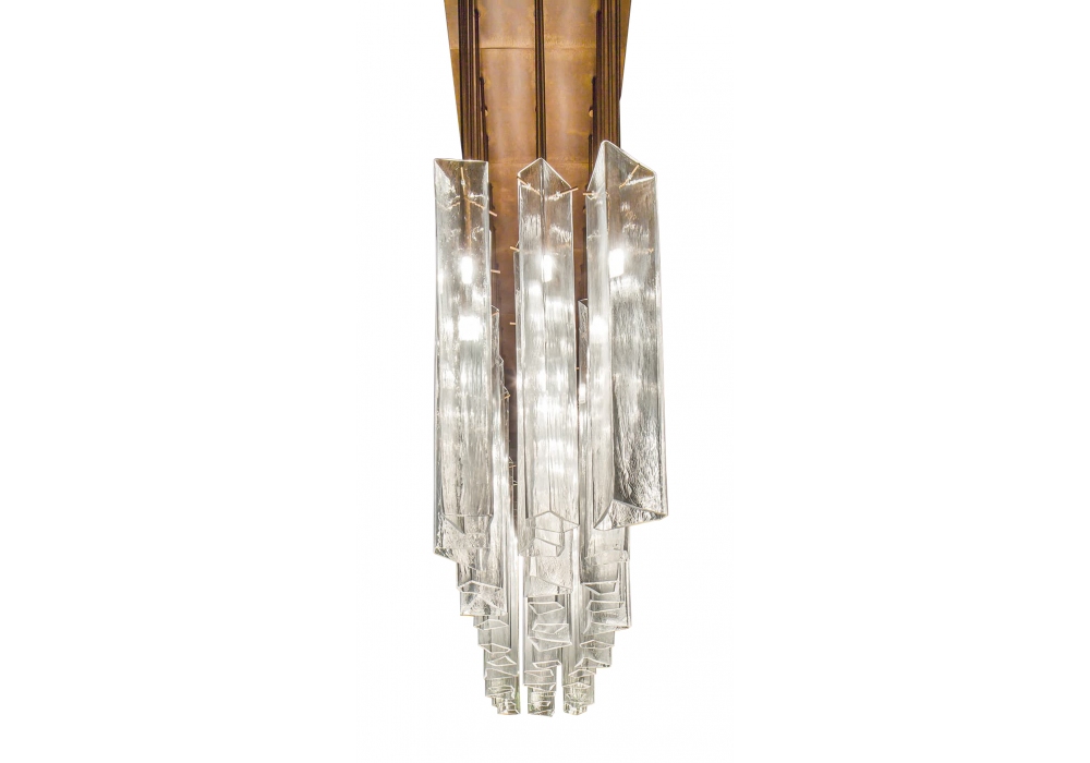 Airlight conçue par Massimo Castagna pour Henge est une lampe à suspension composée d'une structure en métal et de tiges polyédriques en verre de Murano transparent ou gris. Disponible en différentes compositions.