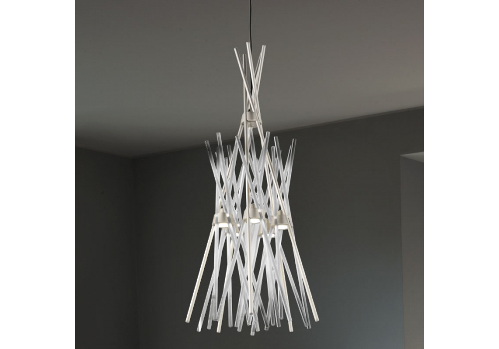 Essence conçue par atelier oï pour Vistosi est une lampe à suspension avec structure portante en métal couleur aluminium bronzé. Les diffuseurs sont structurés en différentes tiges tubulaires de cristal ombragé avec une source lumineuse LED dimmable dans différentes nuances de lumière. Essence est disponible en deux versions différentes.