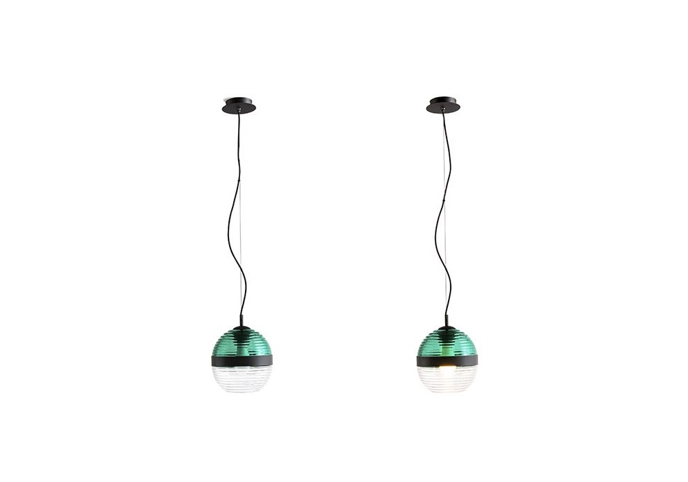 Cord Lamp conçue par Werner Aisslinger pour Cappellini est une suspension réalisée avec un diffuseur composé de deux calottes en verre rayé et de pièces en métal peint en noir. La partie inférieure est toujours transparente et la partie supérieure en verre coloré. Disponible en différentes finitions et dimensions.