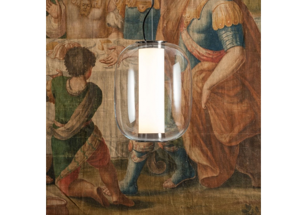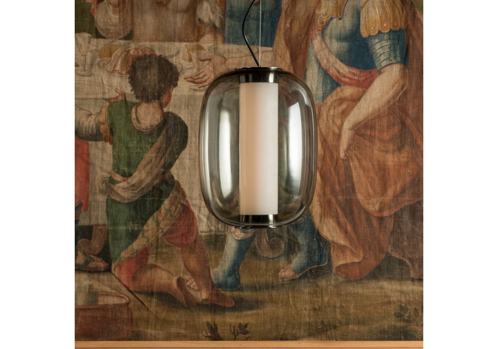 Meridiano conçue par Gabriele et Oscar Buratti pour Fontana Arte est une suspension avec structure portante en métal nickelé et base circulaire. Le diffuseur est ellipsoïdal en verre soufflé tandis que l'intérieur est en verre Pyrex peint en trois finitions différentes : fumé, rose ou transparent. La source lumineuse adoptée est de type LED (incluse) et est équipée d'un double interrupteur qui permet d'éclairer la partie centrale (dimmable) séparément de la partie inférieure du diffuseur. Disponible en différentes dimensions et finitions.
